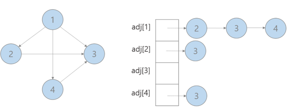 vector <int> adj[] 인접리스트가 있을 때 adj[i]는 노드 i에 연결된 노드들을 원소로 갖는다.